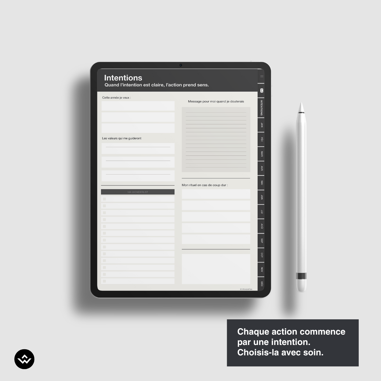 ✔ Une page d’intentions pour poser vos aspirations, définir vos valeurs et lister vos envie.